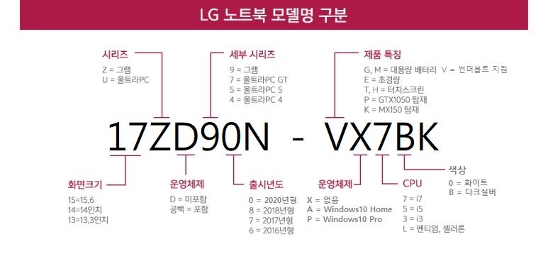 삼성 노트북을 볼까요?NT950XDB – K71ANT – 노트북 품목 (데스크톱은 DB로 표기) 9 – 노트북 종류 5 – 노트북 화면 크기 (5=15인치, 3=13인치) 0 – 노트북 화면 연결 X – 터치 여부 (X, G: 터치 불가, S, Q: 터치 가능) DB – 표기 XK – 그래픽 성능 (K, A: 내장 그래픽, G, X: 외장 그래픽) 7 – 인텔 프로세서 (7 = i7, 5 = i5, 3 = i3) 1 – 램 표기 (1= 16GB, 2= 8GB) A – 유통방식을 의미합니다.