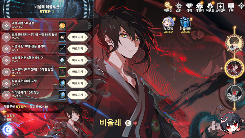 레볼루션 로드는 주어진 퀘스트를 완료하고 보상을 받을 수 있는 시스템입니다. 여기서 모든 임무를 완수하면 그 캐릭터의 초월 재료를 최종적으로 획득할 수 있습니다. 캐릭터를 넘어서면 능력치 상승을 기대할 수 있기 때문에 꾸준히 게임을 플레이해서 획득해야 합니다. 소개한 콘텐츠 외에도 시련의 탑, 랭커 전쟁 등이 있으니 인게임에서 확인해보세요!