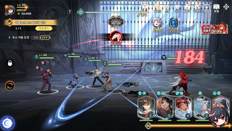 스토리 콘텐츠로는 웹툰 ‘신의 탑’ 이야기가 담겨 있습니다. 스토리를 진행하면서 경험치를 비롯한 각종 보상을 획득할 수 있는 콘텐츠입니다. 중간에 등장하는 애니메이션 연출이 흥미로웠어요. 초반에는 쉽게 진행할 수 있지만 점점 난이도가 높아지기 때문에 전략이 필요하다고 할 수 있습니다.