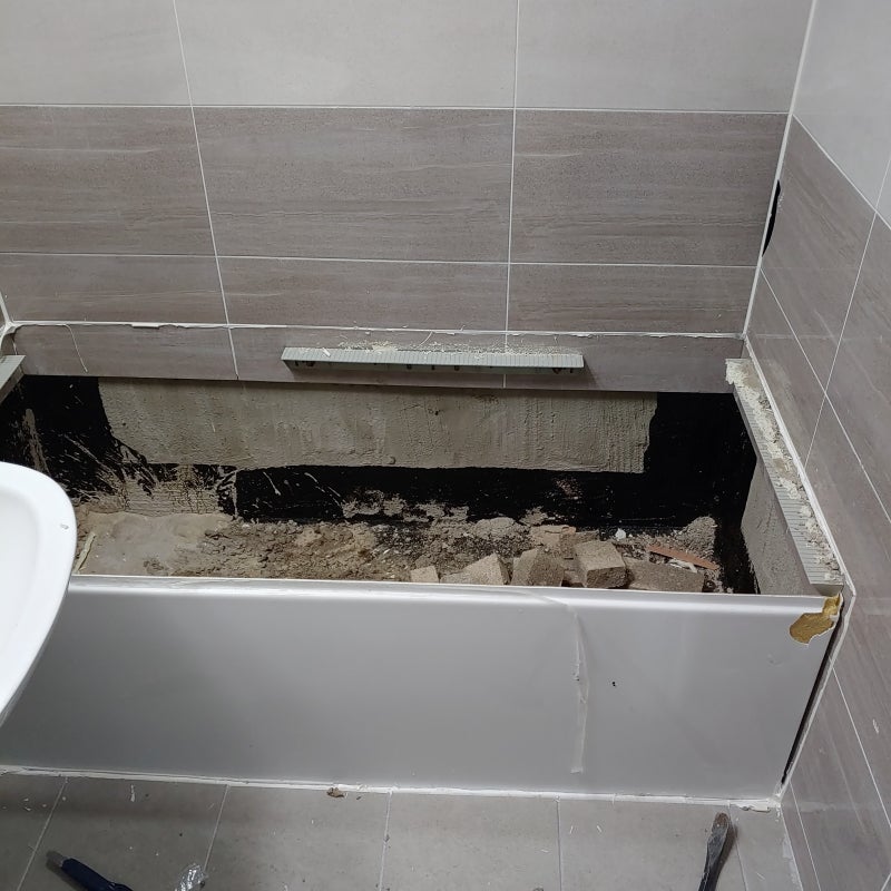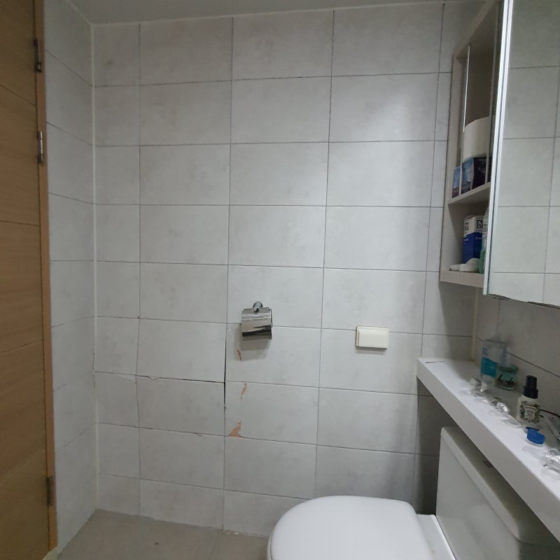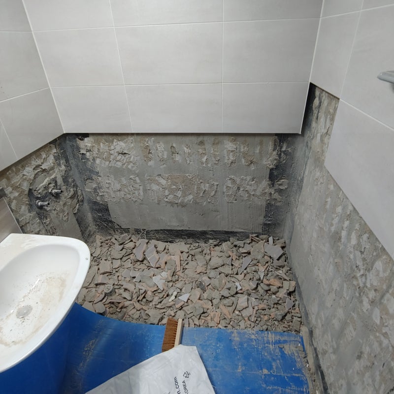 들뜬 벽 타일은 모두 제거했습니다.그리고 하단 부분은 스크래퍼를 사용하여 기존 타일본드인 세라픽스 자국을 긁었습니다.습기에 강한 부착재료 실리콘으로 시공해 보겠습니다.벽면은 충분히 건조시켜 타일 부착에 어려움이 없을 것 같습니다.